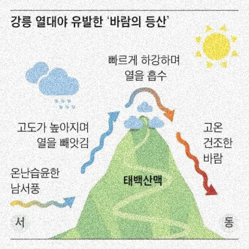 서풍 계열의 바람이 불어올 때, 서쪽 내륙에서는 기온이 비교적 낮거나 평이한 반면, 동해안에서는 공기가 내려오며 가열되어 더 높은 기온을 기록하게 되는 것이죠.